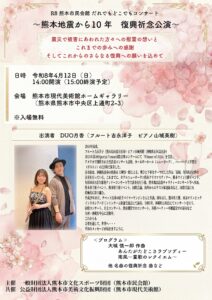 | 令和8年度 熊本市民会館 だれでもどこでもコンサート ~熊本地震から10年 復興祈念公演~ 震災で被害にあわれた方々への慰霊の想いと これまでの歩みへの感謝 そしてこれからのさらなる復興への願いを込めて |
