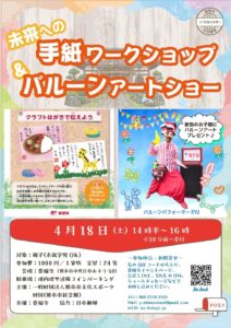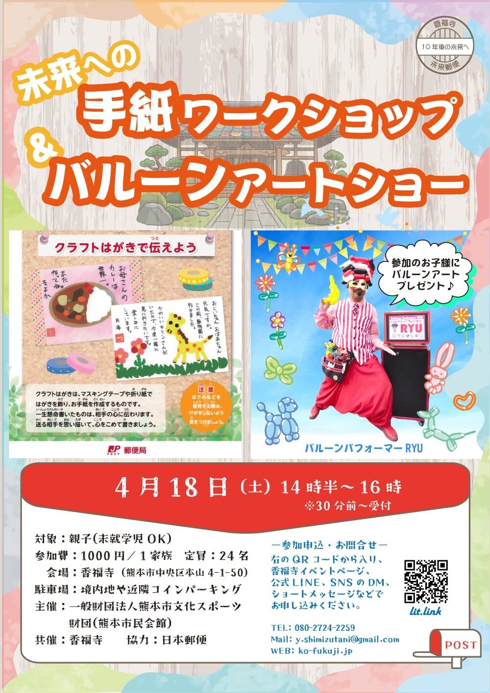 | 香福寺にて、親子で楽しめるイベント 「未来への手紙ワークショップ&バルーンアートショー」を開催いたします。 ワークショップでは、クラフトはがきを使って、 未来の自分や大切な人へ向けた手紙づくりを体験できます。 また、当日はバルーンパフォーマーRYUさんによるバルーンアートショーも開催。 参加されたお子様には、バルーンアートのプレゼントも予定されています。 ご家族で楽しく参加できる催しです。どうぞお気軽にお申し込みください。 |